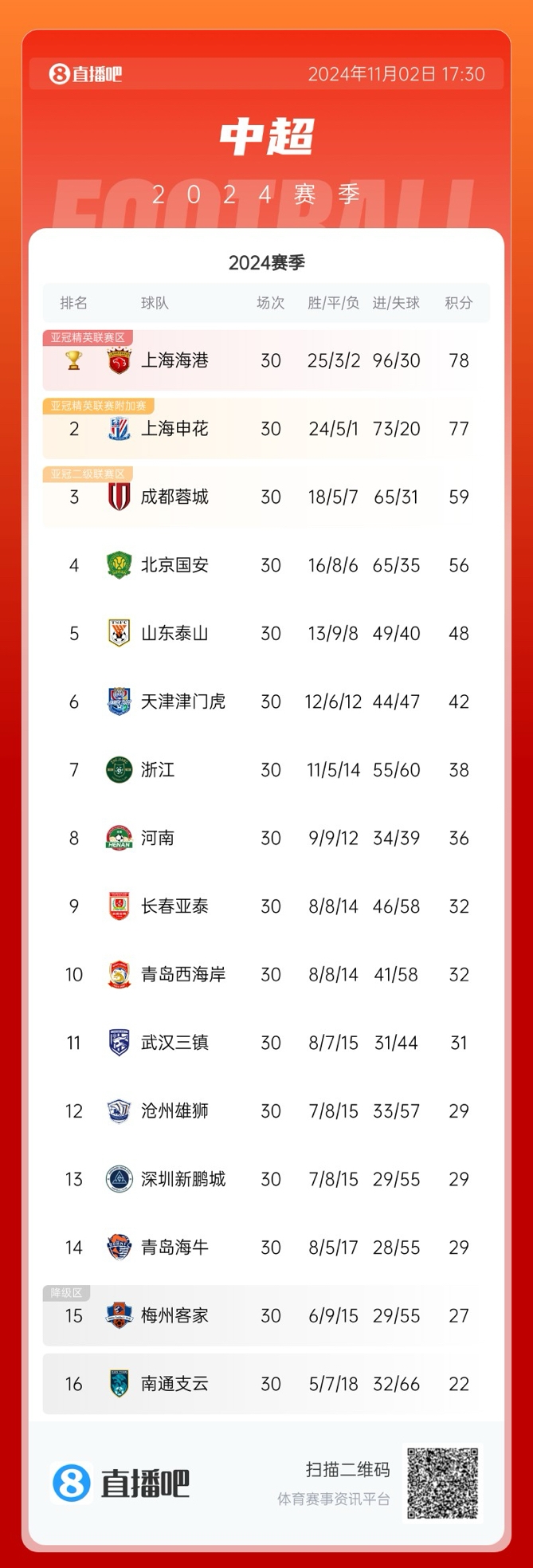 明年再见!中超最终积分榜:海港78申花77 蓉城59国安56泰山48